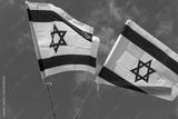 Two Israeli flags waving proudly in the wind against a vibrant blue sky, symbolizing national pride, freedom, and resilience during significant times.