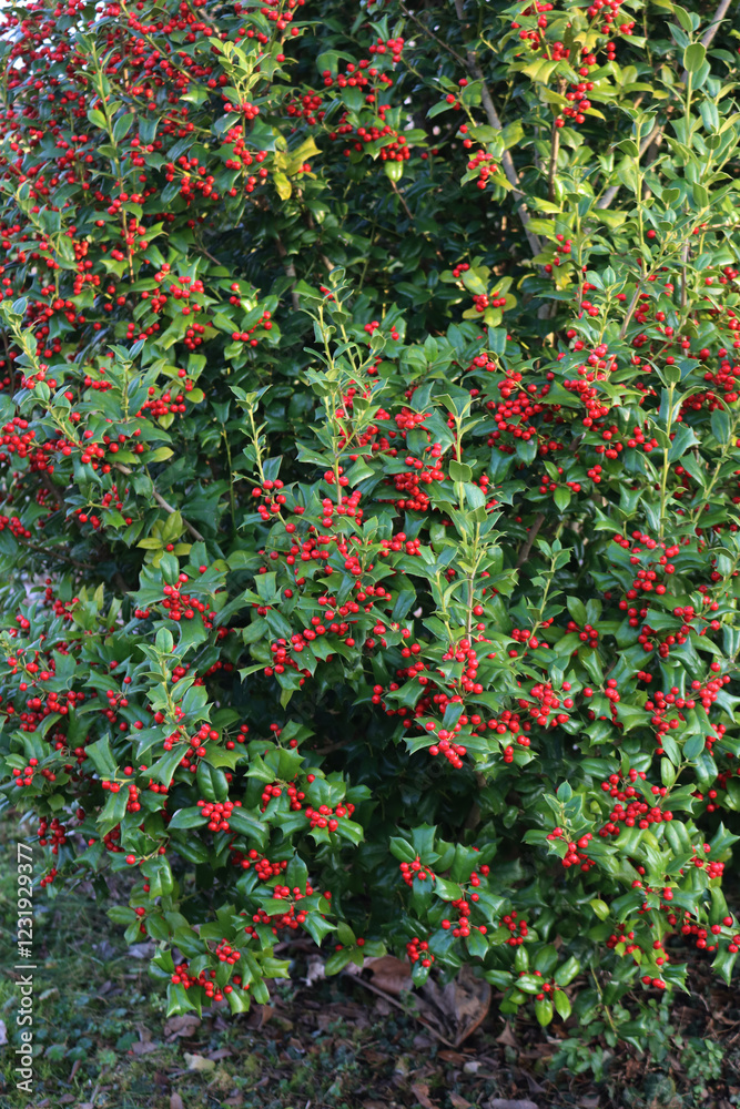 Holly bush with branches with ripe red berries in the garden. Ilex cornuta bush on winter