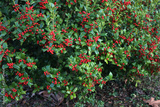 Holly bush with branches with ripe red berries in the garden. Ilex cornuta bush on winter