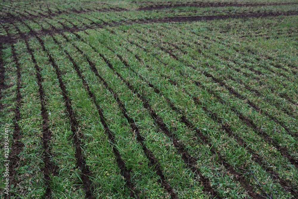 Liquid manure on alfalfa agricultural field in the italian countryside on winter season