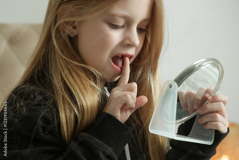 Cute 7 year old girl looking in the mirror her growing front teeth