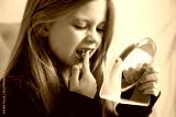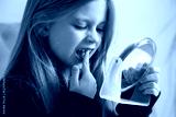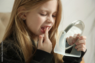 Cute 7 year old girl looking in the mirror her growing front teeth