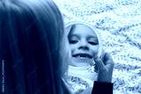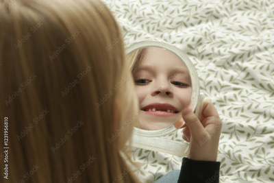 Cute 7 year old girl looking in the mirror her growing front teeth