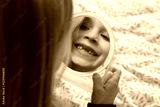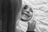 Cute 7 year old girl looking in the mirror her growing front teeth