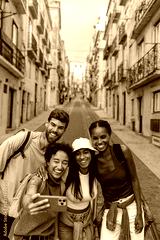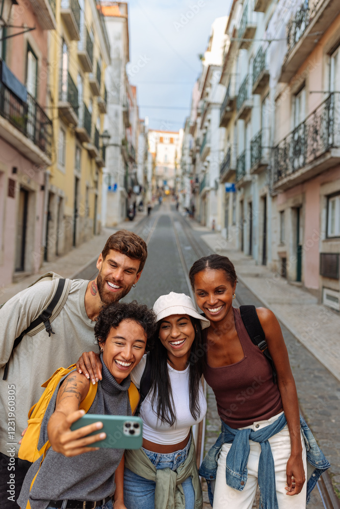 Happy tourists taking a photo of themselves in lisbon, portugal
