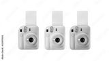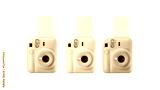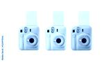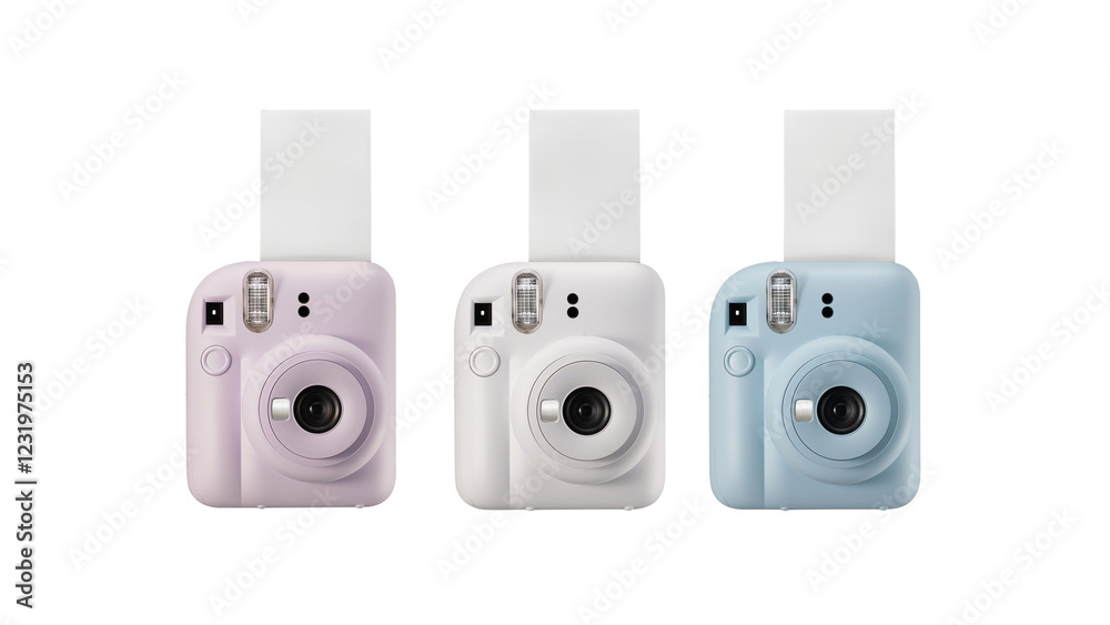 Closeup of pink, white and blue instant photographic cameras, isolated on white background.