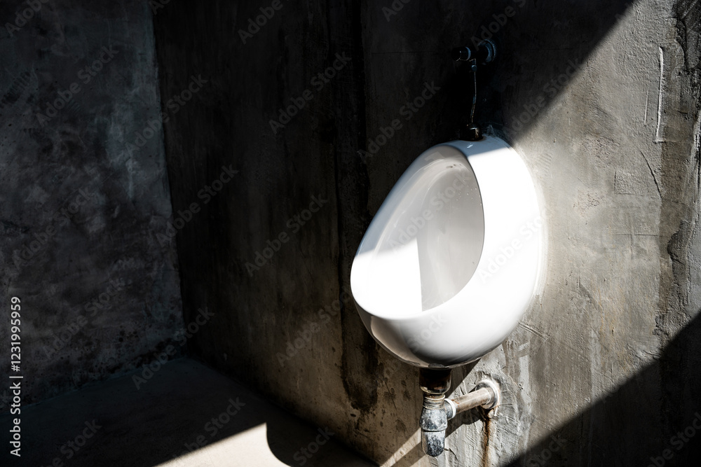 Closeup of one white urinals in men bathroom on loft cement wall design of white ceramic urinals for men in toilet room. Loft style