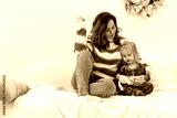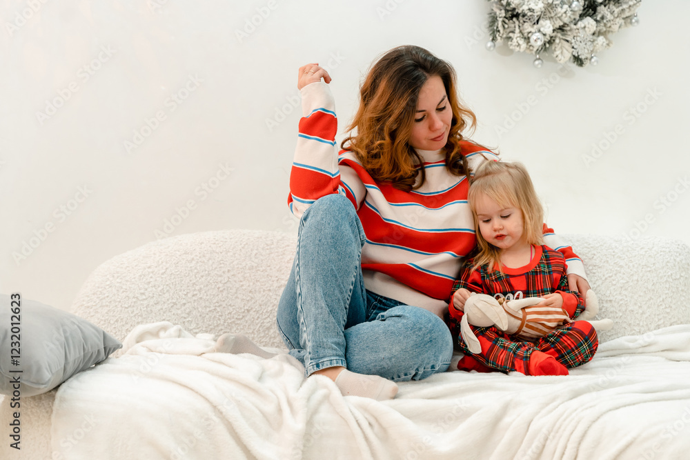 Toddler's daughter is sitting on the couch with her mother at home in the living room before Christmas. Maternal care and love.