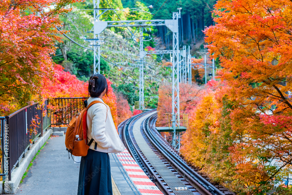 Woman tourist waiting for the train at railway station with autumn leaves background in Kyoto Japan.