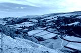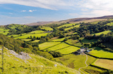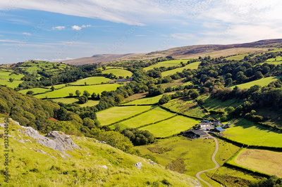 Looking east from Carreg Cennen castle up hill farm farmland toward the Black Mountain, Wales, UK. Brecon Beacons National Park