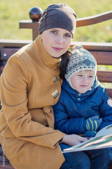 Young woman and little boy sitting on the bench in autumn Park and reading book. Family enjoying time together. Mother teaches son