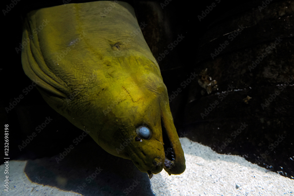 blind green mooray eel close up