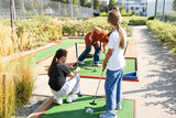 Cute school girl playing mini golf with family. Happy toddler child having fun with outdoor activity. Summer sport for children and adults, outdoors. Family vacations or resort.