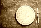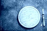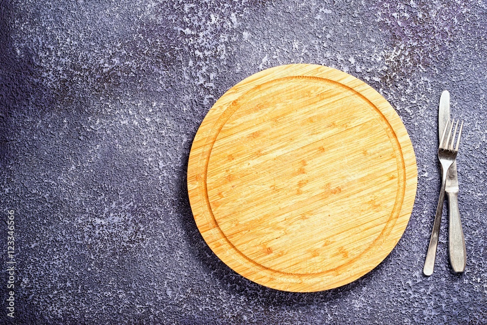 Empty round cutting board on a table with fork and knife, copy space at the side for your text.