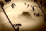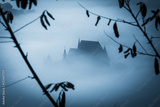Mysterious misty morning over Biertan village, Transylvania, Romania. Blue colors. spooky, Halloween concept