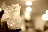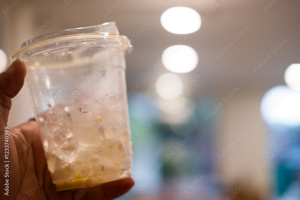 Close up of hand holding iced coffee plastic cup with a little ice with blurred background