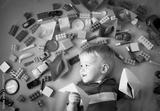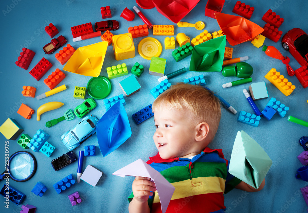 Baby boy lying on the blanket with many toys around
