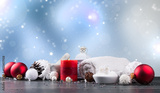spa massage setting, product, oil and christmas decoration on wooden background, Christmas wellness concept