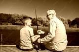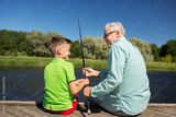 grandfather and grandson fishing on river berth