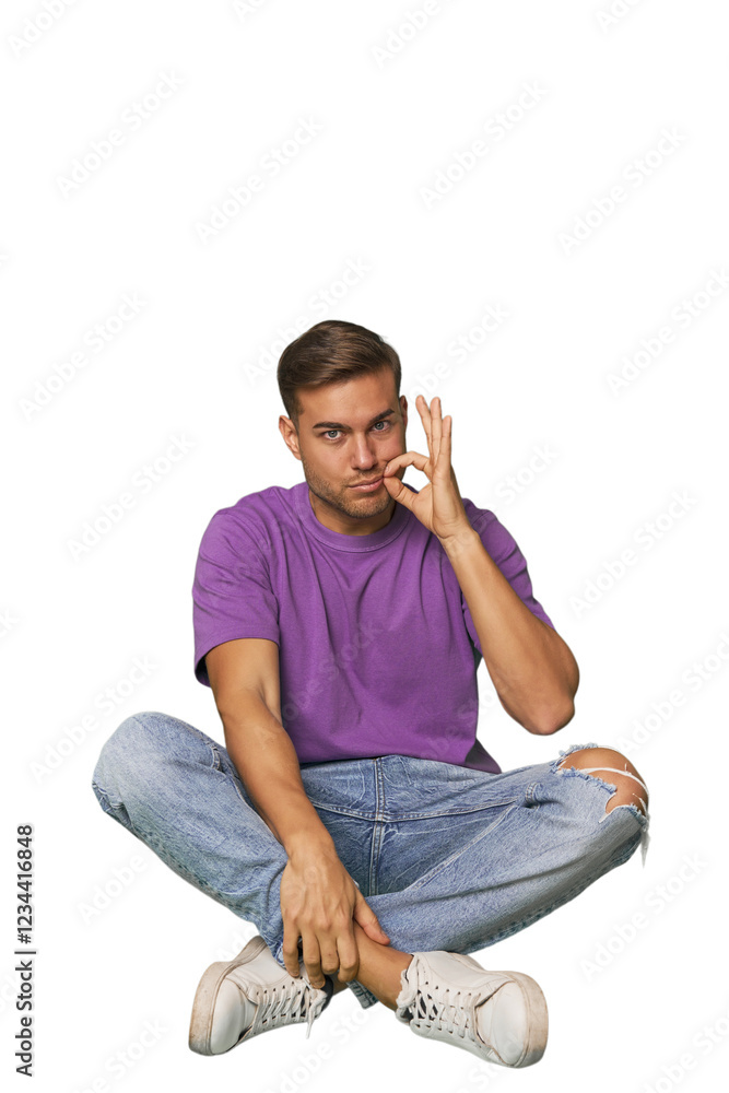 Casual man sitting on floor with fingers on lips keeping a secret.