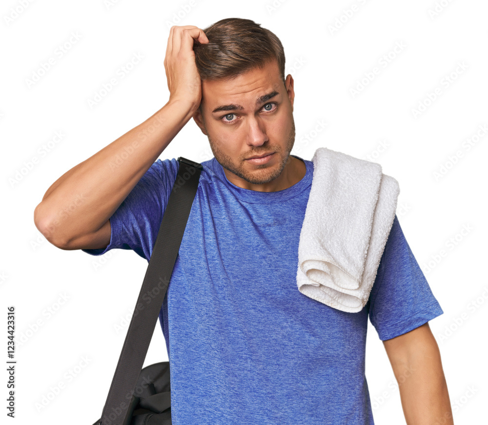 Athlete with gym bag, studio being shocked, she has remembered important meeting.