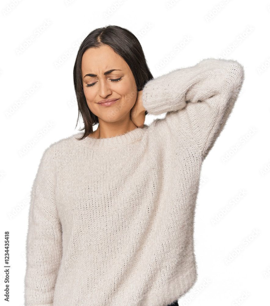 Young Caucasian woman with short hair suffering neck pain due to sedentary lifestyle.