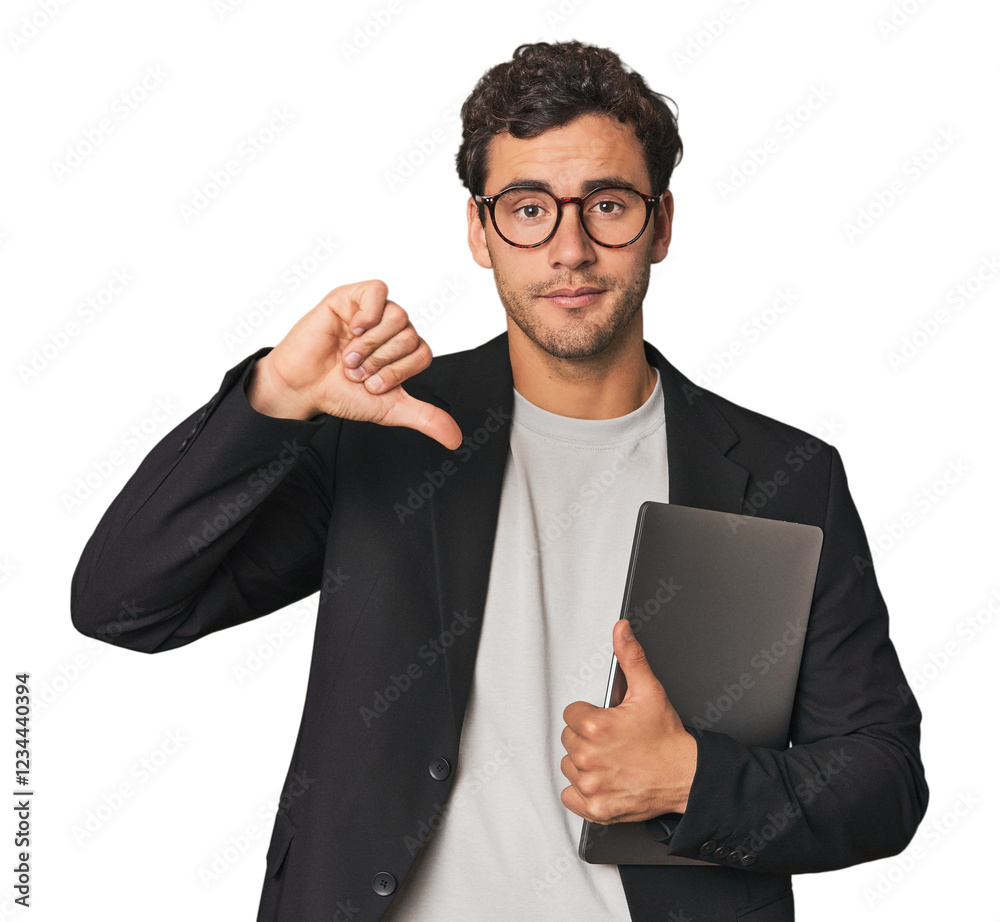 Young Hispanic businessman with laptop showing a dislike gesture, thumbs down. Disagreement concept.