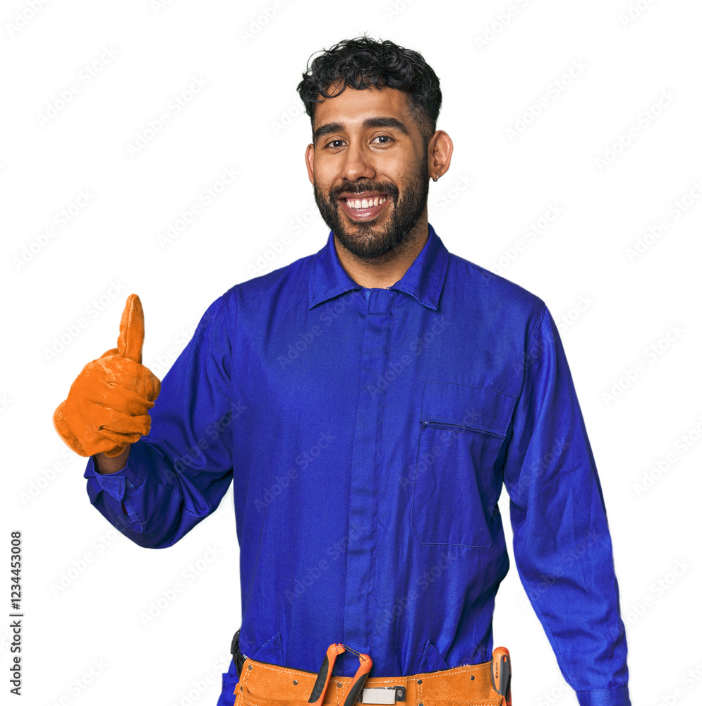 Hispanic worker in blue overalls in studio smiling and raising thumb up