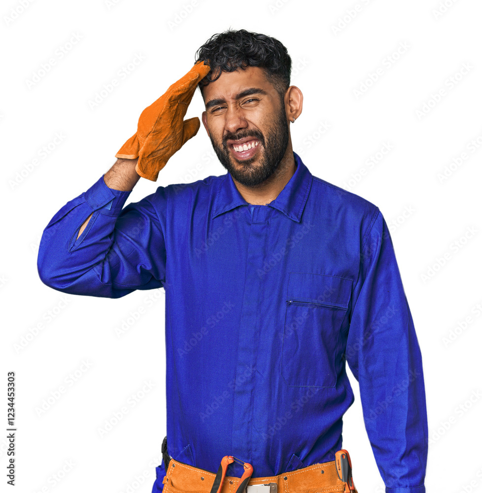 Hispanic worker in blue overalls in studio being shocked, she has remembered important meeting.