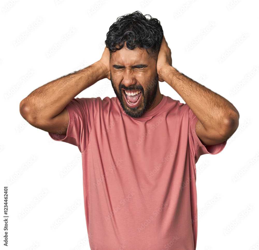 Young Hispanic man isolated covering ears with hands trying not to hear too loud sound.
