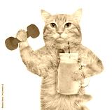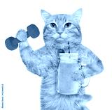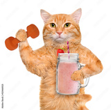 Fitness cat drinking fruit smoothie after a workout . Fitness and healthy lifestyle concept.