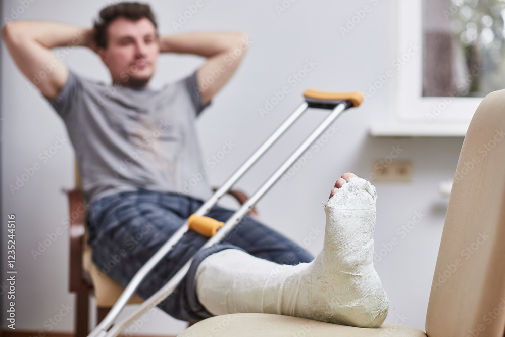 Close up of a young man's Plaster leg cast and after a running injury or fall