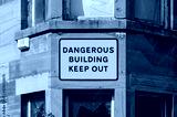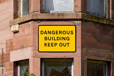 Dangerous building keep out sign on building ready to be demolished