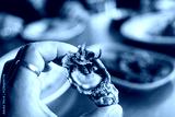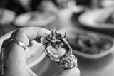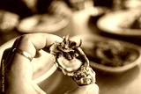 Fresh oyster in shell on hand that topping with fried shallot. The most delicious oyster