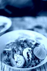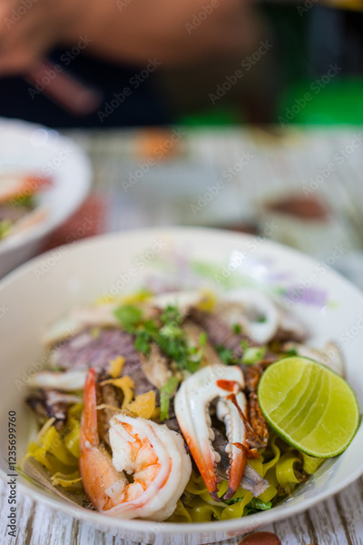 A bowl of special food of dry egg yellow noodle with crawfish, shrimp and crab, sold in Chanthaburi province, Thailand