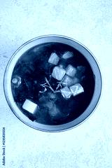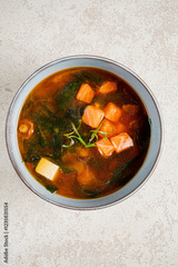 A steaming bowl of nutritious soup showcases vibrant vegetables, soft tofu, and rich broth, inviting warmth and comfort on a chilly day, infused with spices and herbs.
