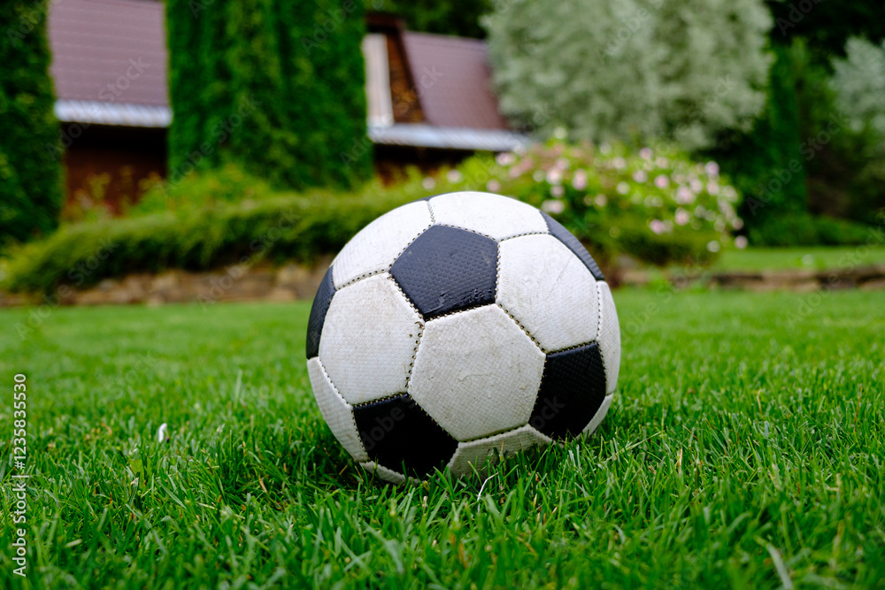 A soccer ball sits on lush green grass, surrounded by blooming flowers and trees under clear blue skies. The tranquility of the garden offers a perfect backdrop for outdoor play.