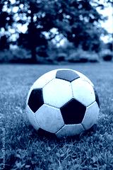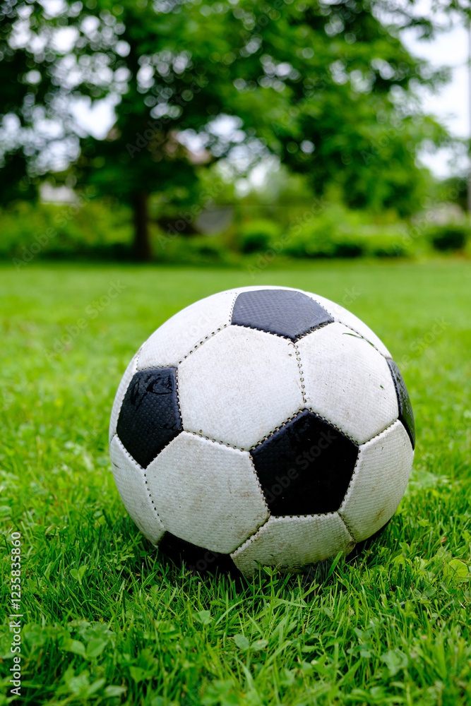 A classic black and white soccer ball rests on a lush green field, surrounded by vibrant grass and gentle trees swaying in the breeze.