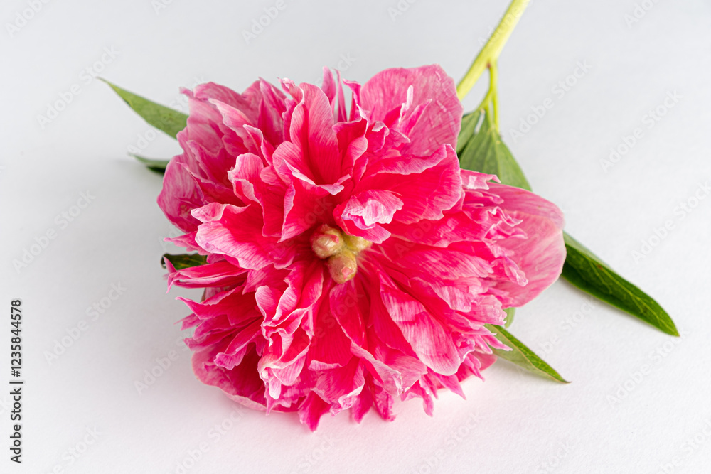 A stunning pink peony blooms with layers of ruffled petals against a serene white backdrop. The flower's lush colors and form evoke feelings of elegance and tranquility.