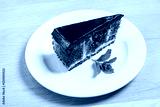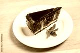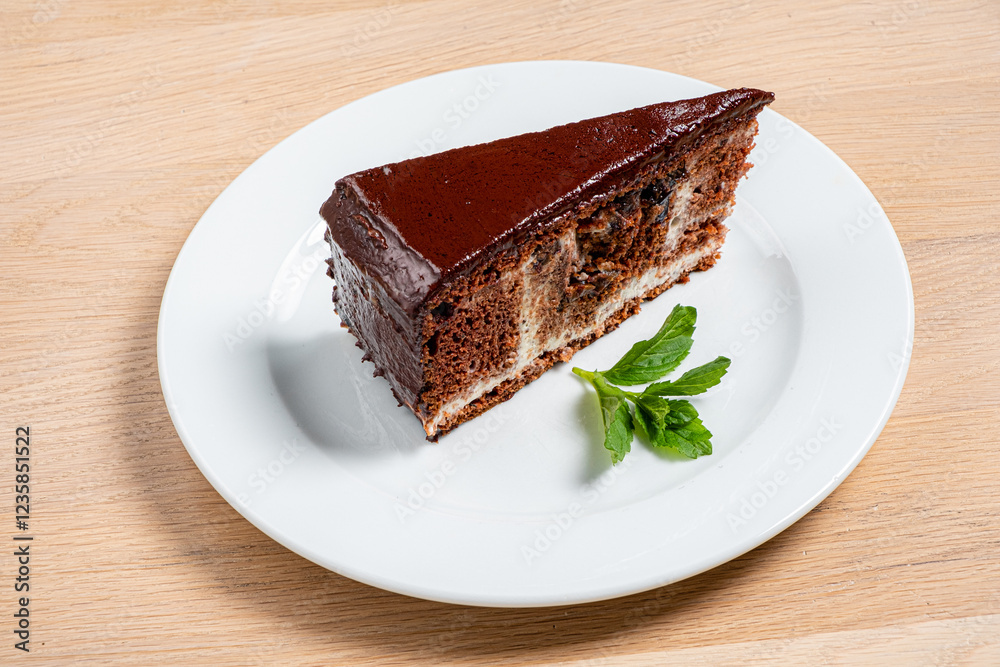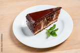 A decadent slice of chocolate cake sits elegantly on a white plate, featuring rich chocolate frosting and a pop of fresh mint, ideal for dessert enthusiasts who crave indulgence.