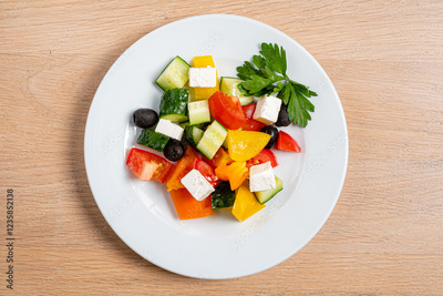 A colorful mix of cucumbers, peppers, and olives on a white plate, topped with fresh cheese and parsley, embodies the essence of healthy eating.