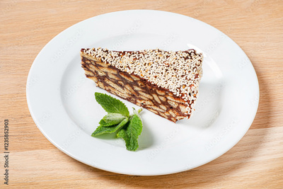 Enjoying a delectable slice of a layered dessert adorned with sesame seeds, resting elegantly on a white plate alongside fresh mint leaves, showcasing culinary artistry.