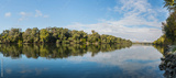 Early autumn landscape panorama with the river and a locomotive crossing the railway bridge .