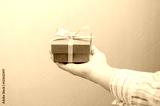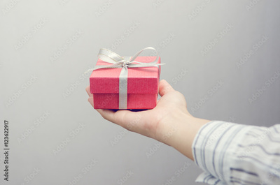 Closeup, Woman hand holding red gift box, female giving gift, New year holidays and greeting season concept