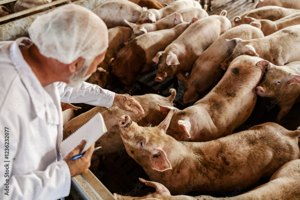 An old veterinarian petting curious pig in pen and doing health checkup at animal farm.