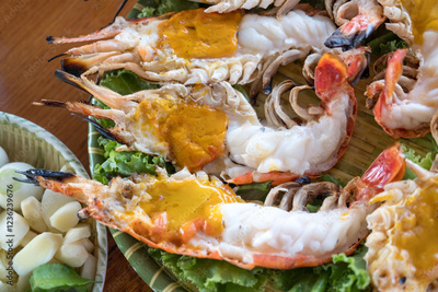Grilled giant river shrimp. Popular Thai food, The shrimp head will be in creamy orange color with an extremely good taste.