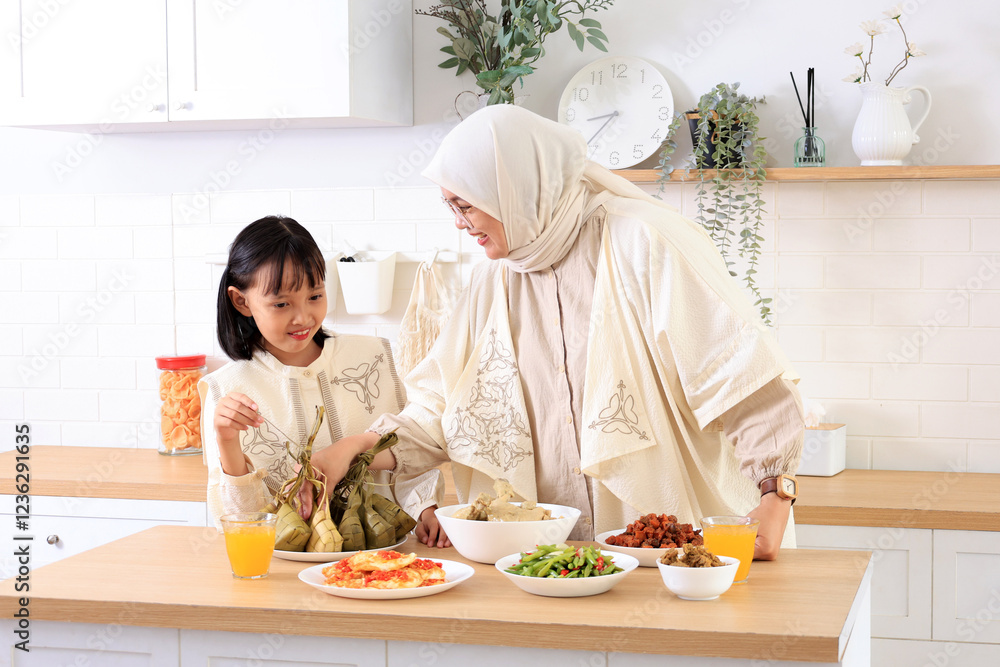 Mom and Daughter Preparing Ketupat Lebaran for Eid Al Fitr Celebration at Home
