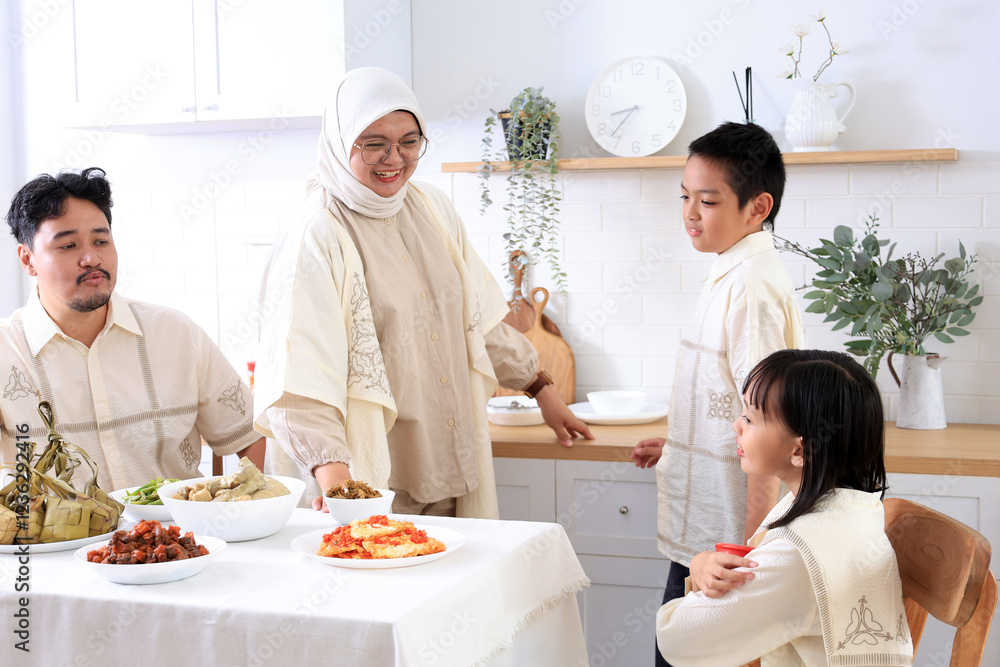 Young Asian Muslim Family Celebrating Eid Mubarak, Eating Lebaran Menu at Home