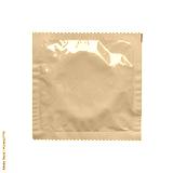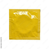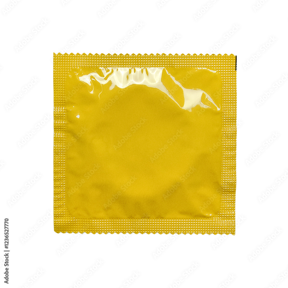 A vibrant yellow, sealed foil condom wrapper isolated on a clean white background, ideal for health, safe sex, and lifestyle-related stock photography.
