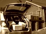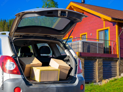 Boxes in trunk of car. Containers for moving. Car with boxes near country house. Preparing for move. Delivery of things to village cottage. Moving boxes in trunk. Parcels to automobile